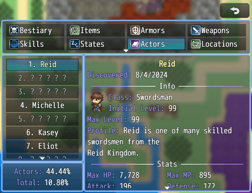Some bugs were also fixed. The encyclopedia will now not attempt to draw the actor nickname if the actor has no nickname. The encyclopedia will also wait for actor faces to load before trying to draw them. This plugin now works with [CGMZ] Scene Backgrounds, though it is still recommended to use this plugin to manage the backgrounds for the encyclopedia scene as it allows for different images for each category. Finally, some unused parameters were removed.