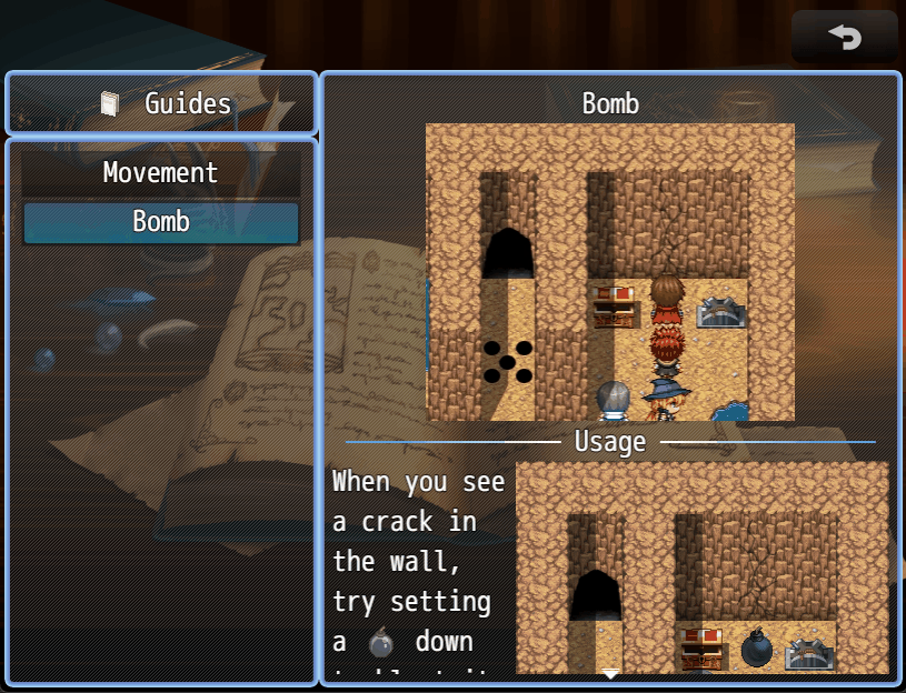 This version adds videos to the possible display items for your manual entries. You can use this to show a video of the mechanic, such as a bomb exploding a wall open. Videos will loop and have no volume, so the behavior will be similar to that of a gif. When setting up your video, please be sure to provide the width/height of your video as the plugin will need that to determine how much space to reserve for the video. See below gif for how it can look: