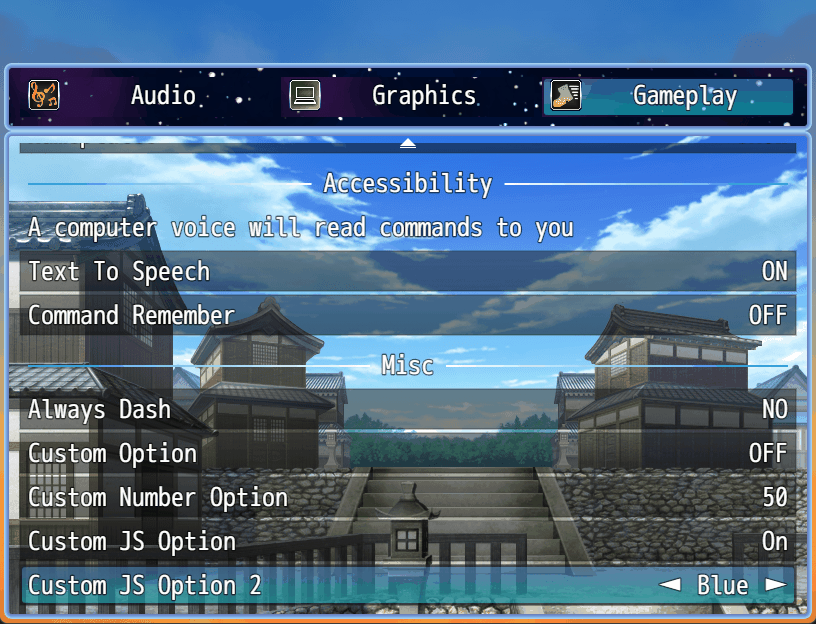 This version adds a new option type, the JS Option. This is an option that is completely controlled by JavaScript, so you can basically make it do anything you want with the limitation being your skill at writing JS code. This was prioritized so that you can add any option for other plugins as needed rather than needing to wait while other option types get added in an easy-to-use no-code format. This plugin should now be able to handle any type of option your game needs. See below gif for an example of what it can do: