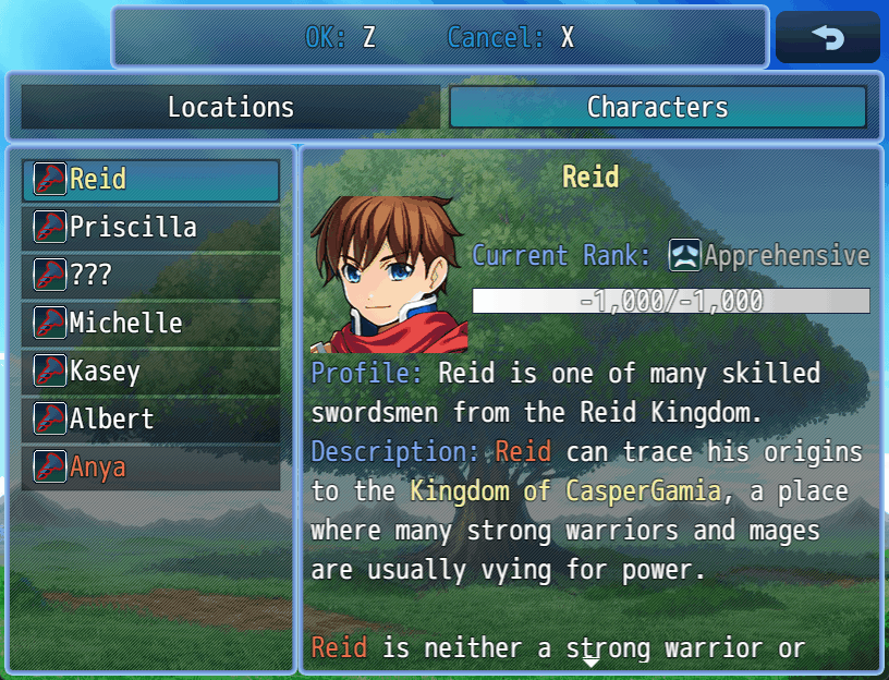 This update adds the possibility for negative ranks. Instead of counting up reputation, these ranks count down reputation below 0. For example, you may have a "hated" reputation that is from 0 to -5000 reputation. You can have multiple negative ranks, similar to how positive ranks work. The reputation system will progress through each rank based on the total rep the player has, and shows the total amount needed to get to the next rank in the progress bar. If using a negative rank, please be sure to set the reputation so that it can go below 0, otherwise your negative ranks will not be possible to reach for the player.